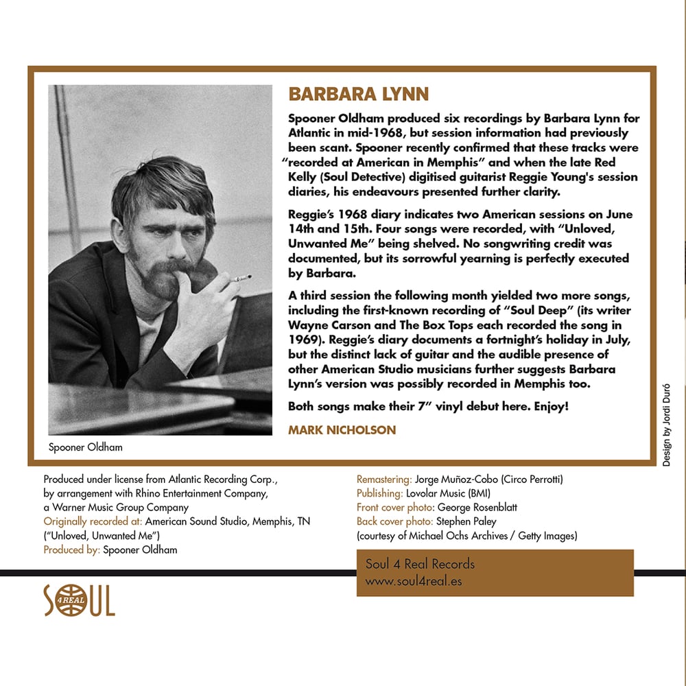 Spooner Oldham produced six recordings on Barbara Lynn for Atlantic in mid-1968, but session information had previously been scant. Spooner Oldham recently confirmed that these tracks were recorded at American Studios in Memphis, and when the late Red Kelly (Soul Detective) digitised Reggie Young's session diaries his endeavours presented further clarity.