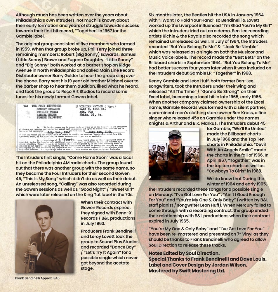 Producers Frank Bendinelli and Leroy Lovett took the group to Sound Plus Studios and recorded “Dance Boy” / “Let’s Try It Again” for a possible single which never got beyond the acetate stage. We do know that during the winter of 1964 and early 1965, the Intruders recorded these songs for a possible single on Mercury: “I’ve Got Love For You” , “Ain’t I Good Enough For You” and “You’re My One & Only Baby” (written by B&L staff pianist / songwriter Leon Huff). When Mercury failed to come through with a recording contract, the group ended their relationship with B&L productions when their contract expired in July 1965.