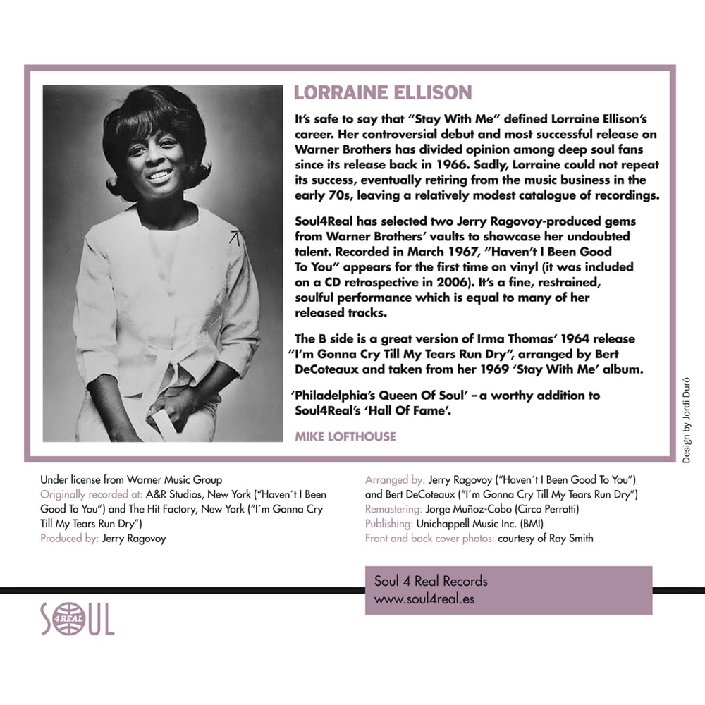 Soul4Real has selected two Jerry Ragovoy-produced gems from Warner Brothers´ vaults to showcase her undoubted talent. Recorded in March 1967, "Haven't I Been Good To You" appears for the first time on vinyl (it was included on a CD retrospective in 2006). It's a fine, restrained, soulful performance which is equal to many of her released tracks.
